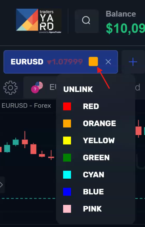 * Wenn du den **Chart-Tab**, die **Watchlist** und den **Trading-Tab** mit derselben Farbe verknüpfst, arbeiten diese Tabs **synchron** zusammen.