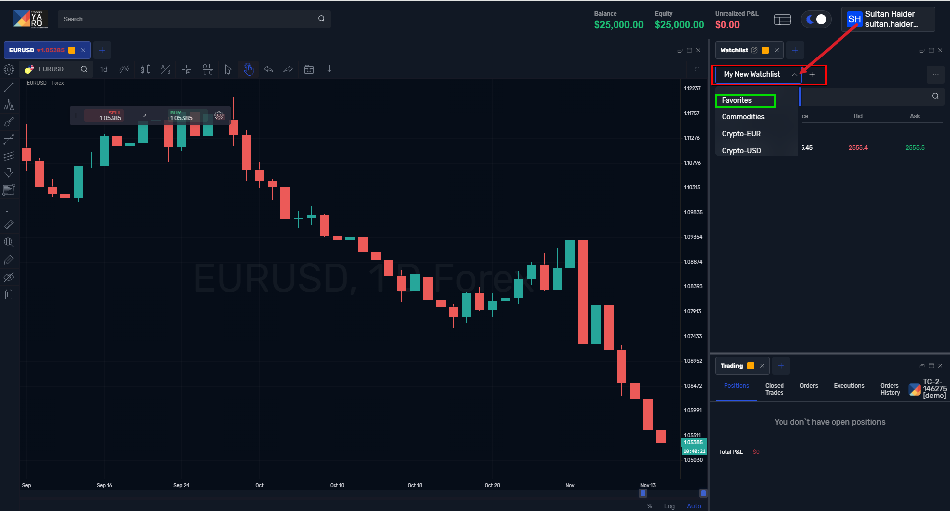 There is a default favorite watchlist that starts out empty, allowing you to add your preferred symbols as you wish. To add symbols to your favorite watchlist, follow these steps: