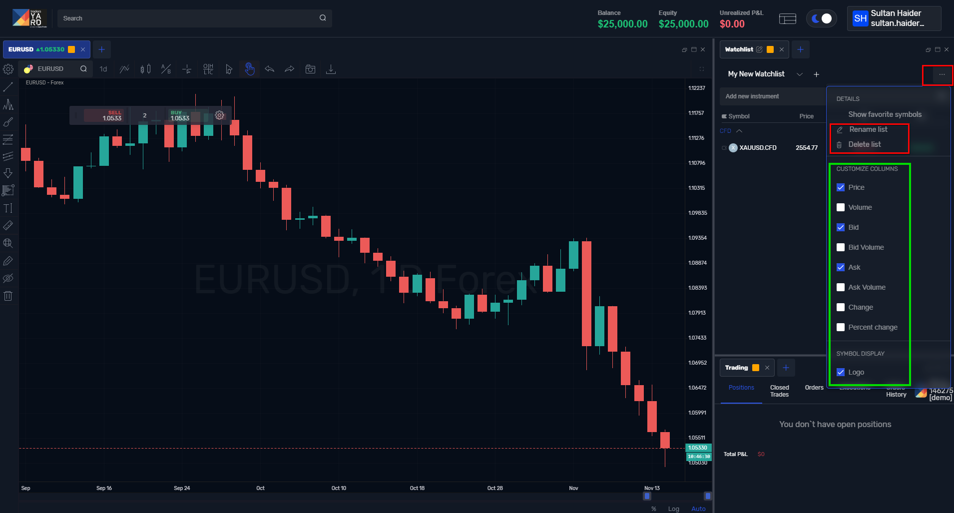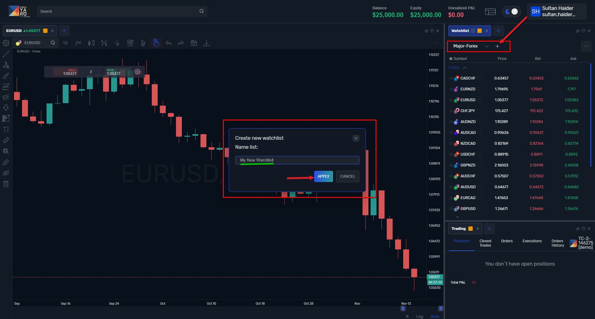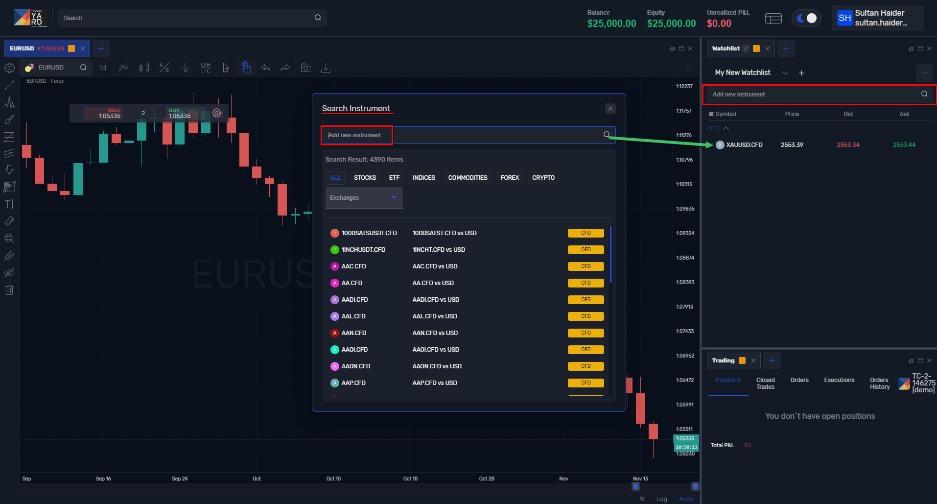 * To add a new instrument to your watchlist, click on the "Add New Instrument" bar located under the name of your watchlist. This will take you to the instrument search section, where you can type the symbol of the instrument. Click on the instrument in the search results to add it to your new watchlist.